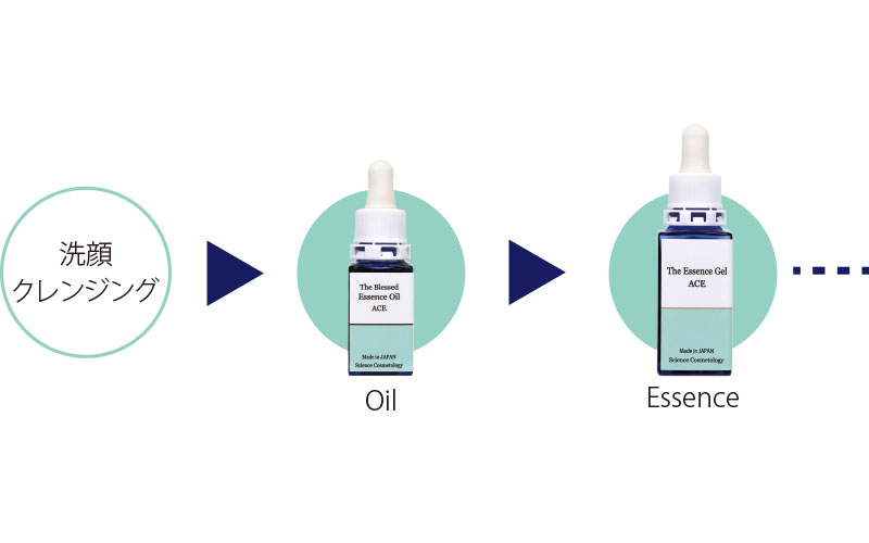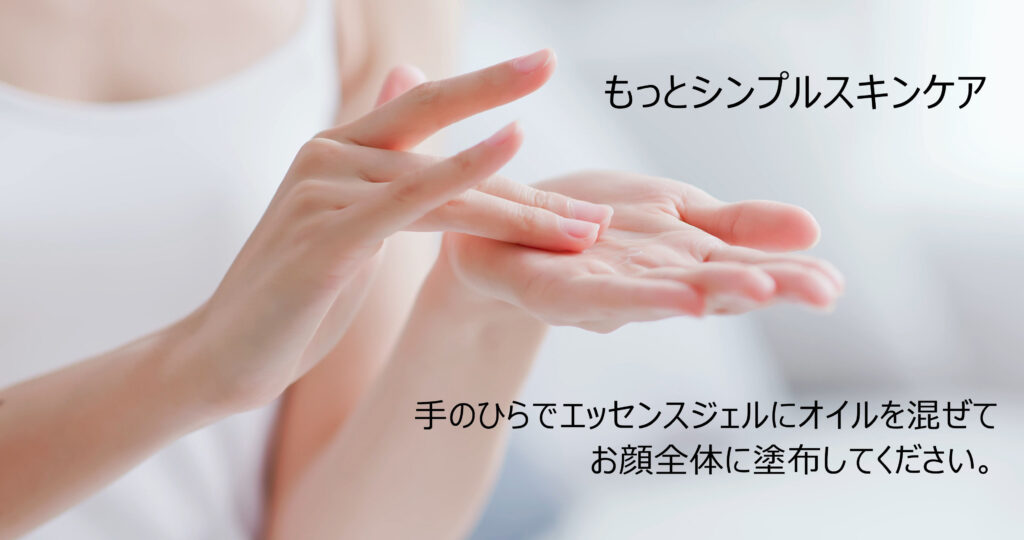 洗顔後、オイル1~2滴を手のひらにとり、お顔を包み込むように塗布します。つぎに、エッセンスジェルもお顔全体に優しく塗布します。