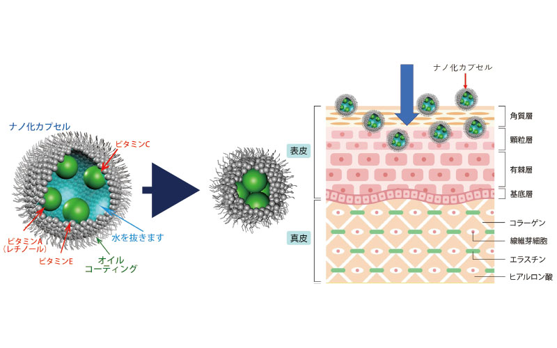 ナノカプセルに、ビタミンA(レチノール)・ビタミンC・ビタミンEを閉じこめオイルコーティングした後にカプセルから水分を抜き、成分をパウダー状にすることによって、有効成分のみをお肌に届けます。